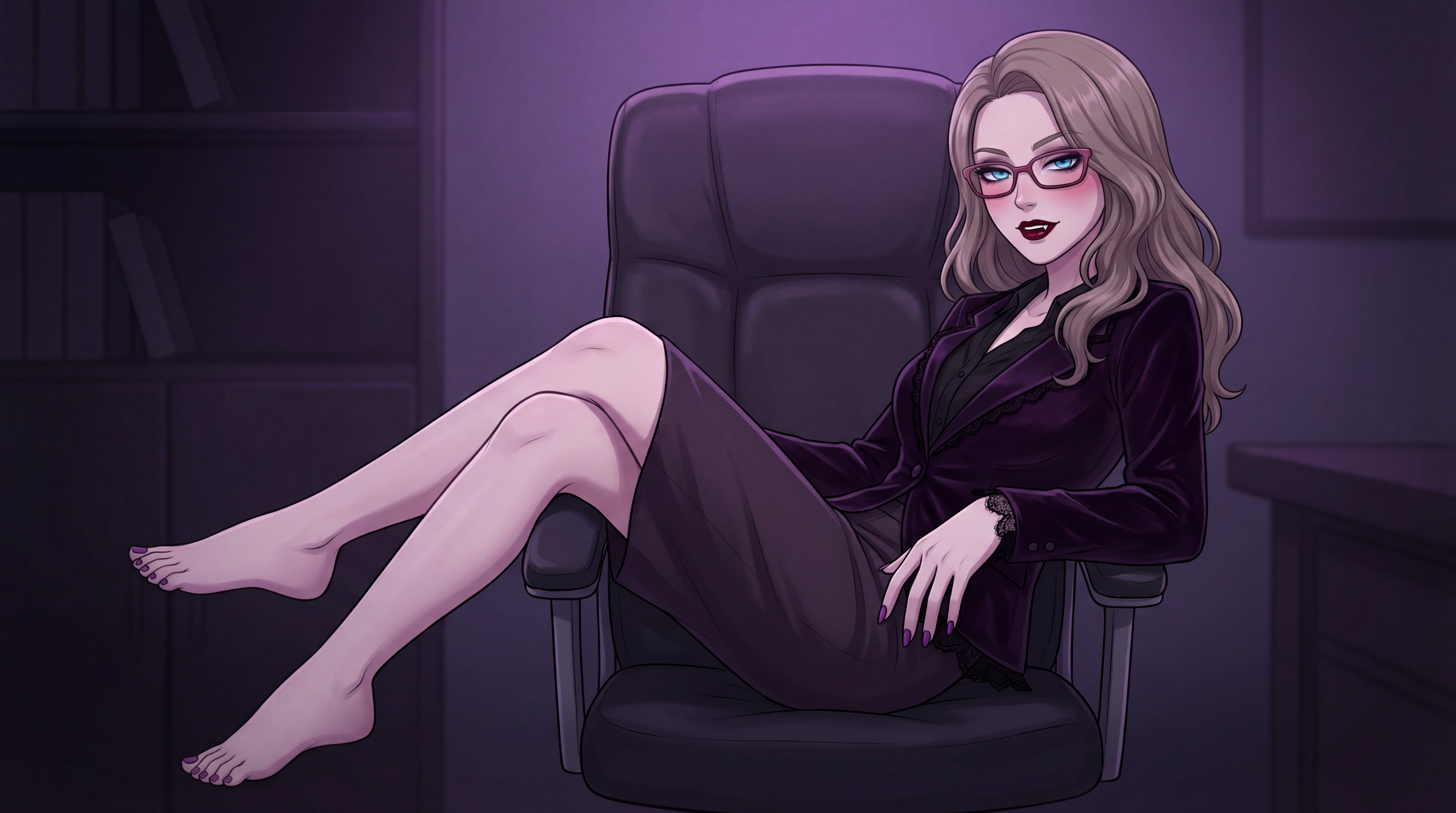 A woman in glasses and a blazer relaxes in an office, barefoot with feet on a desk. She holds a steaming mug, with a cityscape visible through the window.